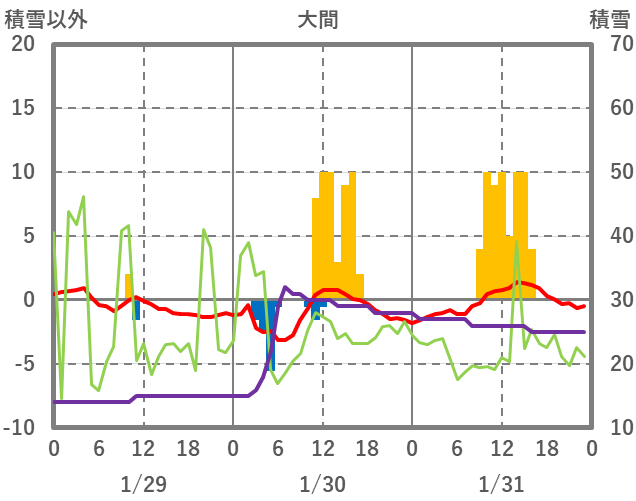 | 日 | 時 | 気温 | 降水 | 風向/風速 | 日照 | 積雪 | 降雪 |