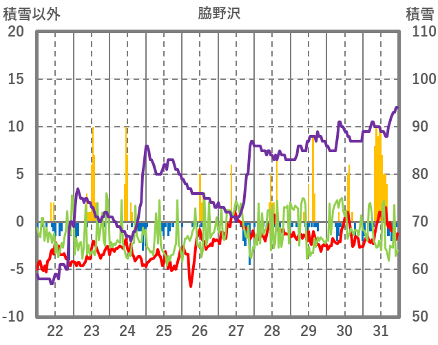| 日 | 時 | 気温 | 降水 | 風向/風速 | 日照 | 積雪 | 降雪 |