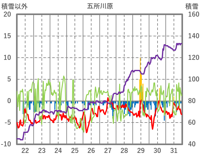 | 日 | 時 | 気温 | 降水 | 風向/風速 | 日照 | 積雪 | 降雪 |
