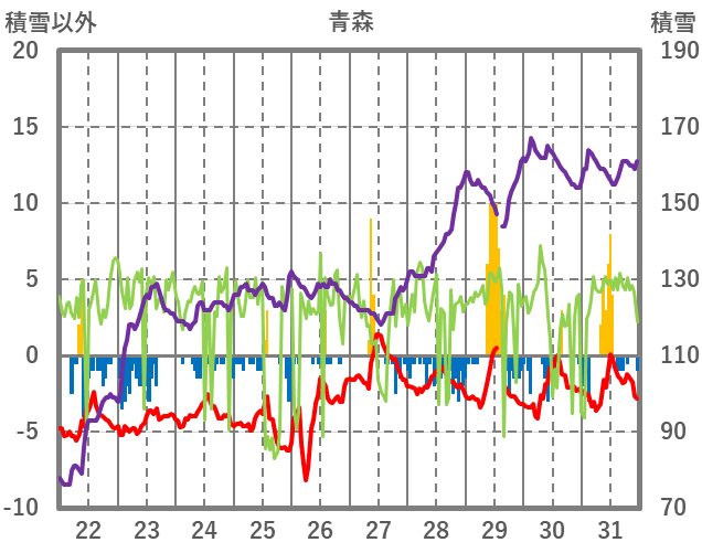 | 日 | 時 | 気温 | 降水 | 風向/風速 | 日照 | 積雪 | 降雪 |