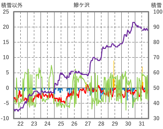 | 日 | 時 | 気温 | 降水 | 風向/風速 | 日照 | 積雪 | 降雪 |