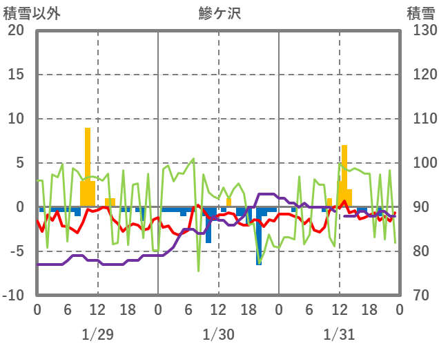 | 日 | 時 | 気温 | 降水 | 風向/風速 | 日照 | 積雪 | 降雪 |