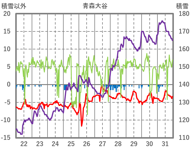 | 日 | 時 | 気温 | 降水 | 風向/風速 | 日照 | 積雪 | 降雪 |