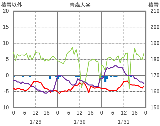 | 日 | 時 | 気温 | 降水 | 風向/風速 | 日照 | 積雪 | 降雪 |