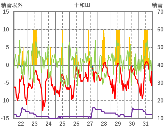 | 日 | 時 | 気温 | 降水 | 風向/風速 | 日照 | 積雪 | 降雪 |