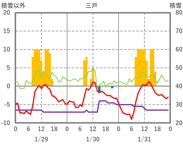 | 日 | 時 | 気温 | 降水 | 風向/風速 | 日照 | 積雪 | 降雪 |