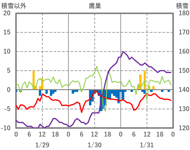 | 日 | 時 | 気温 | 降水 | 風向/風速 | 日照 | 積雪 | 降雪 |