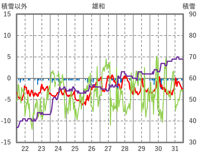 | 日 | 時 | 気温 | 降水 | 風向/風速 | 日照 | 積雪 | 降雪 |