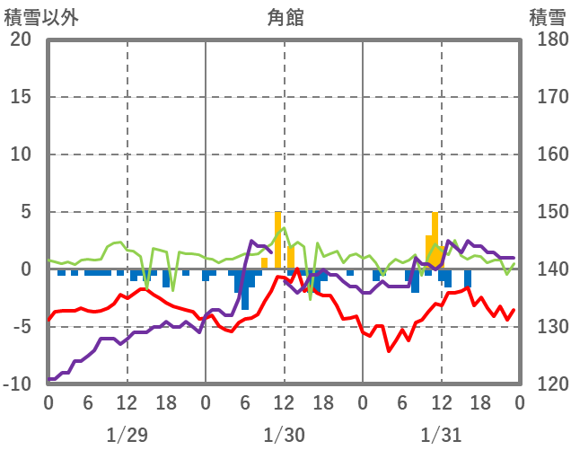 | 日 | 時 | 気温 | 降水 | 風向/風速 | 日照 | 積雪 | 降雪 |