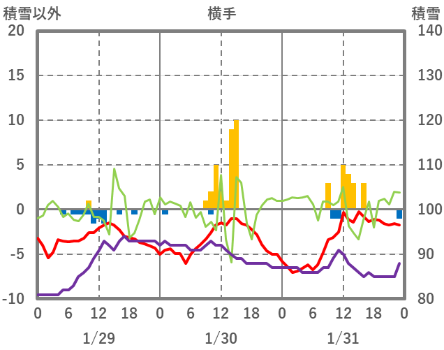 | 日 | 時 | 気温 | 降水 | 風向/風速 | 日照 | 積雪 | 降雪 |