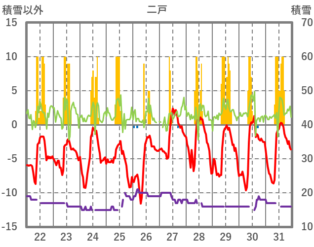 | 日 | 時 | 気温 | 降水 | 風向/風速 | 日照 | 積雪 | 降雪 |
