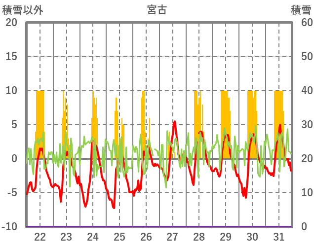 | 日 | 時 | 気温 | 降水 | 風向/風速 | 日照 | 積雪 | 降雪 |