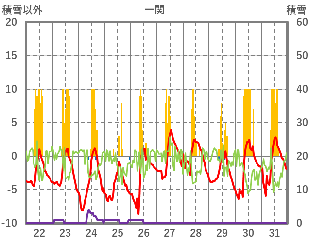 | 日 | 時 | 気温 | 降水 | 風向/風速 | 日照 | 積雪 | 降雪 |