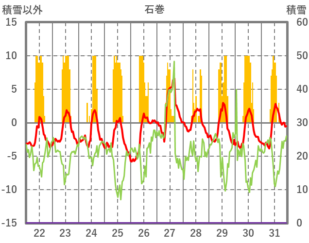 | 日 | 時 | 気温 | 降水 | 風向/風速 | 日照 | 積雪 | 降雪 |
