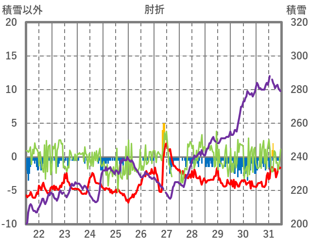 | 日 | 時 | 気温 | 降水 | 風向/風速 | 日照 | 積雪 | 降雪 |