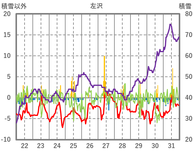 | 日 | 時 | 気温 | 降水 | 風向/風速 | 日照 | 積雪 | 降雪 |