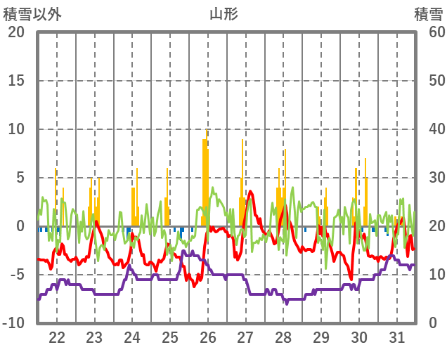 | 日 | 時 | 気温 | 降水 | 風向/風速 | 日照 | 積雪 | 降雪 |