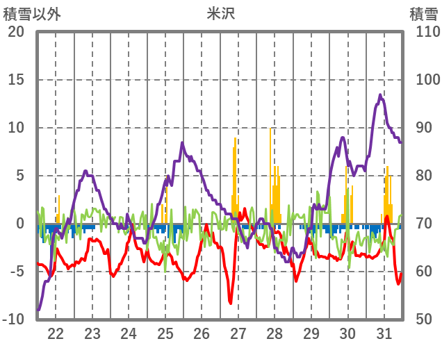 | 日 | 時 | 気温 | 降水 | 風向/風速 | 日照 | 積雪 | 降雪 |
