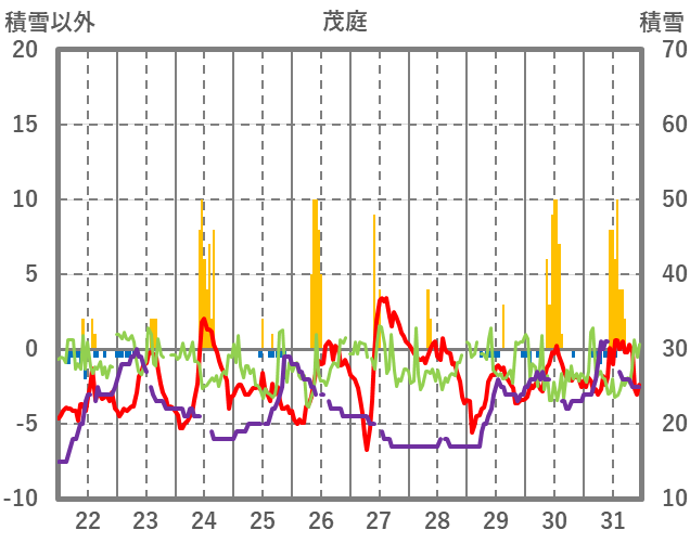 | 日 | 時 | 気温 | 降水 | 風向/風速 | 日照 | 積雪 | 降雪 |