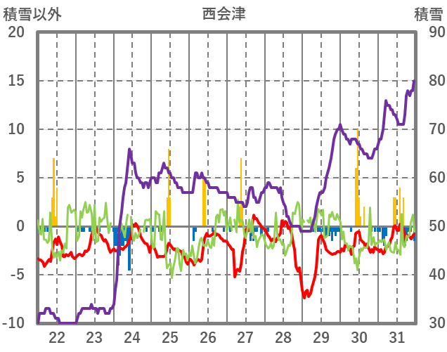 | 日 | 時 | 気温 | 降水 | 風向/風速 | 日照 | 積雪 | 降雪 |