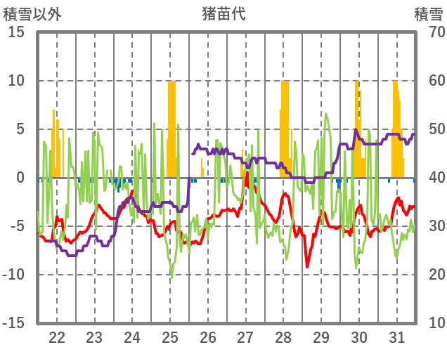 | 日 | 時 | 気温 | 降水 | 風向/風速 | 日照 | 積雪 | 降雪 |