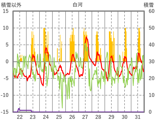 | 日 | 時 | 気温 | 降水 | 風向/風速 | 日照 | 積雪 | 降雪 |