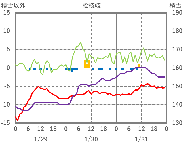 | 日 | 時 | 気温 | 降水 | 風向/風速 | 日照 | 積雪 | 降雪 |