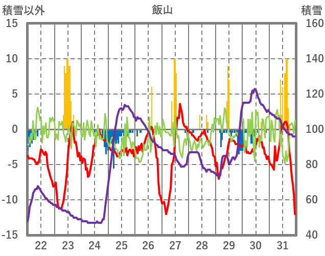| 日 | 時 | 気温 | 降水 | 風向/風速 | 日照 | 積雪 | 降雪 |