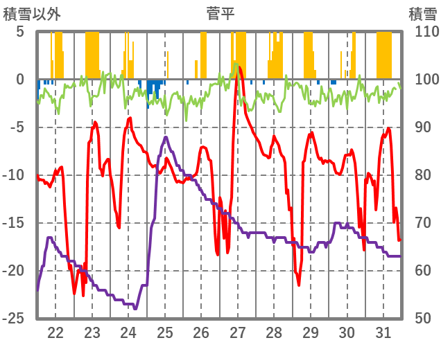 | 日 | 時 | 気温 | 降水 | 風向/風速 | 日照 | 積雪 | 降雪 |