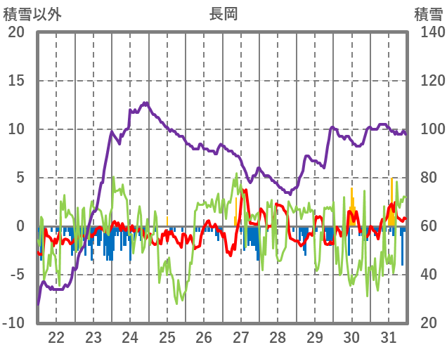 | 日 | 時 | 気温 | 降水 | 風向/風速 | 日照 | 積雪 | 降雪 |
