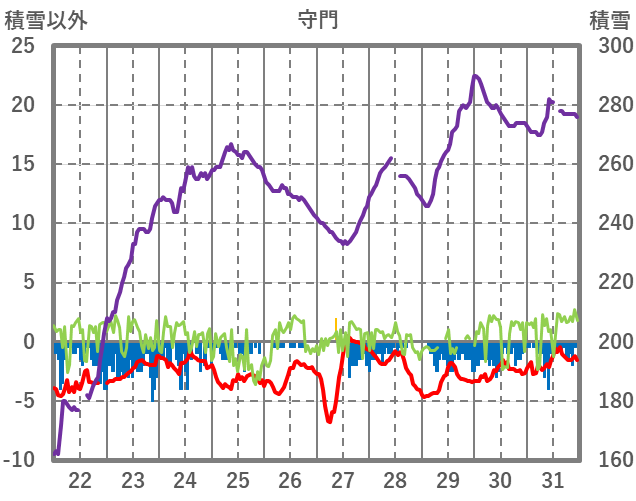 | 日 | 時 | 気温 | 降水 | 風向/風速 | 日照 | 積雪 | 降雪 |