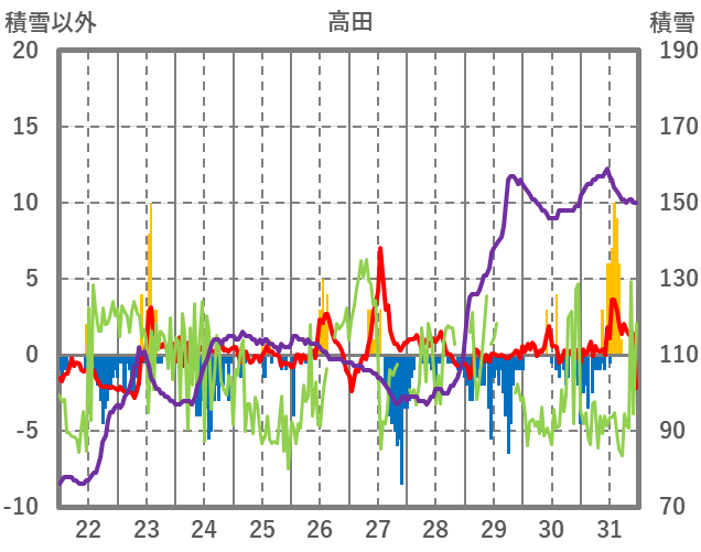 | 日 | 時 | 気温 | 降水 | 風向/風速 | 日照 | 積雪 | 降雪 |