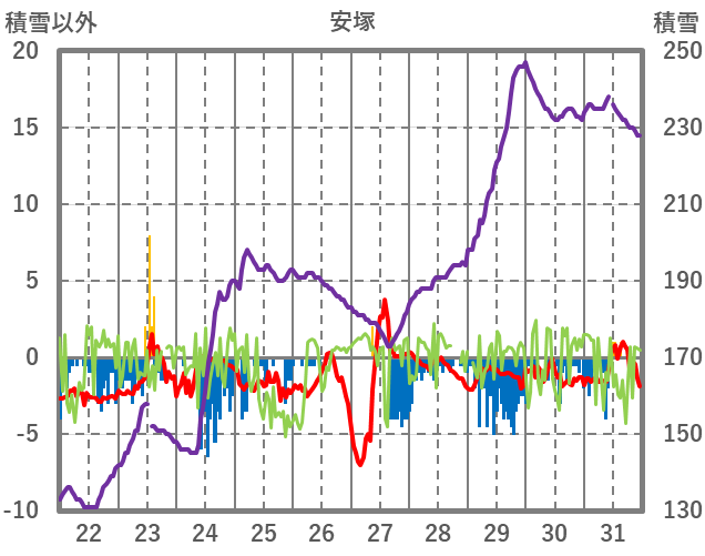 | 日 | 時 | 気温 | 降水 | 風向/風速 | 日照 | 積雪 | 降雪 |