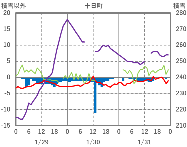 | 日 | 時 | 気温 | 降水 | 風向/風速 | 日照 | 積雪 | 降雪 |
