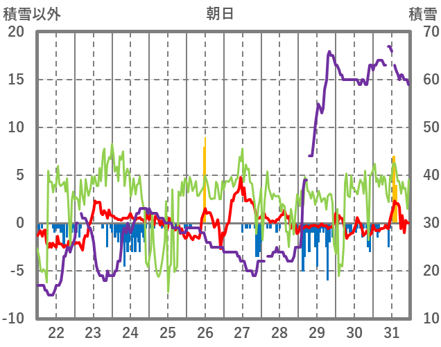 | 日 | 時 | 気温 | 降水 | 風向/風速 | 日照 | 積雪 | 降雪 |