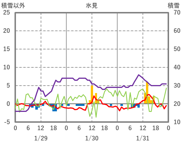 | 日 | 時 | 気温 | 降水 | 風向/風速 | 日照 | 積雪 | 降雪 |