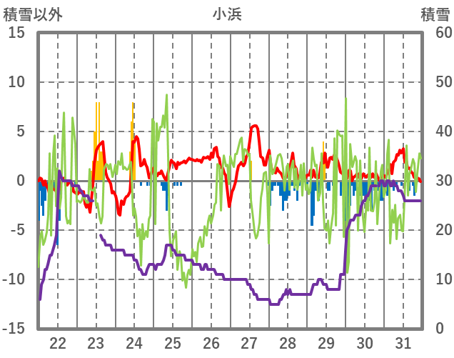 | 日 | 時 | 気温 | 降水 | 風向/風速 | 日照 | 積雪 | 降雪 |