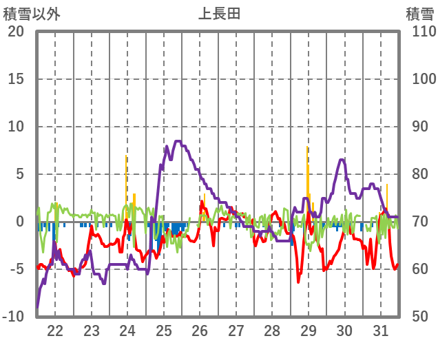 | 日 | 時 | 気温 | 降水 | 風向/風速 | 日照 | 積雪 | 降雪 |