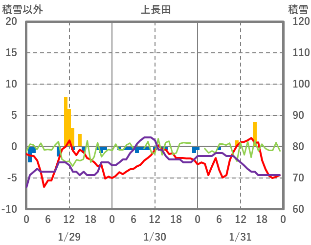 | 日 | 時 | 気温 | 降水 | 風向/風速 | 日照 | 積雪 | 降雪 |