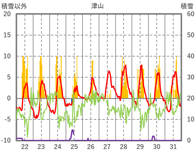 | 日 | 時 | 気温 | 降水 | 風向/風速 | 日照 | 積雪 | 降雪 |