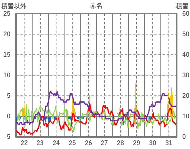 | 日 | 時 | 気温 | 降水 | 風向/風速 | 日照 | 積雪 | 降雪 |
