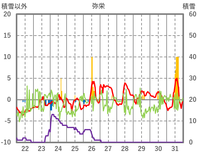 | 日 | 時 | 気温 | 降水 | 風向/風速 | 日照 | 積雪 | 降雪 |