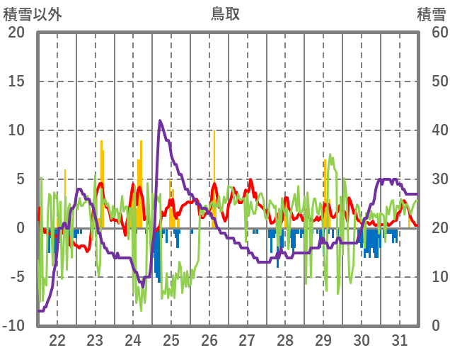 | 日 | 時 | 気温 | 降水 | 風向/風速 | 日照 | 積雪 | 降雪 |