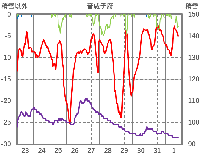 | 日 | 時 | 気温 | 降水 | 風向/風速 | 日照 | 積雪 | 降雪 |