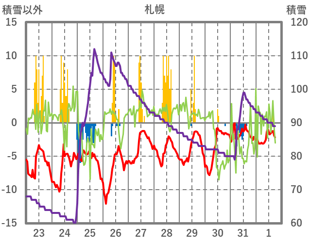 | 日 | 時 | 気温 | 降水 | 風向/風速 | 日照 | 積雪 | 降雪 |