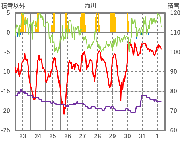 | 日 | 時 | 気温 | 降水 | 風向/風速 | 日照 | 積雪 | 降雪 |