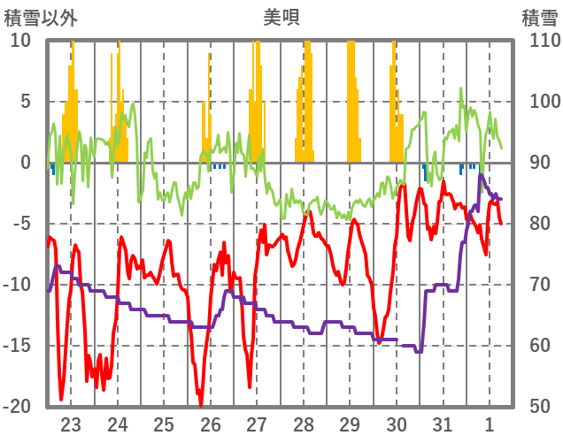 | 日 | 時 | 気温 | 降水 | 風向/風速 | 日照 | 積雪 | 降雪 |