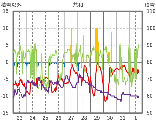 | 日 | 時 | 気温 | 降水 | 風向/風速 | 日照 | 積雪 | 降雪 |