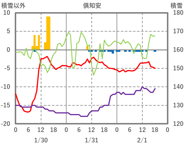 | 日 | 時 | 気温 | 降水 | 風向/風速 | 日照 | 積雪 | 降雪 |