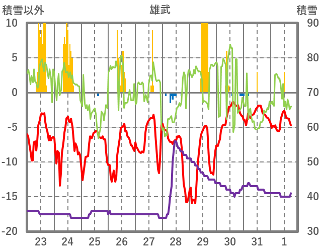 | 日 | 時 | 気温 | 降水 | 風向/風速 | 日照 | 積雪 | 降雪 |
